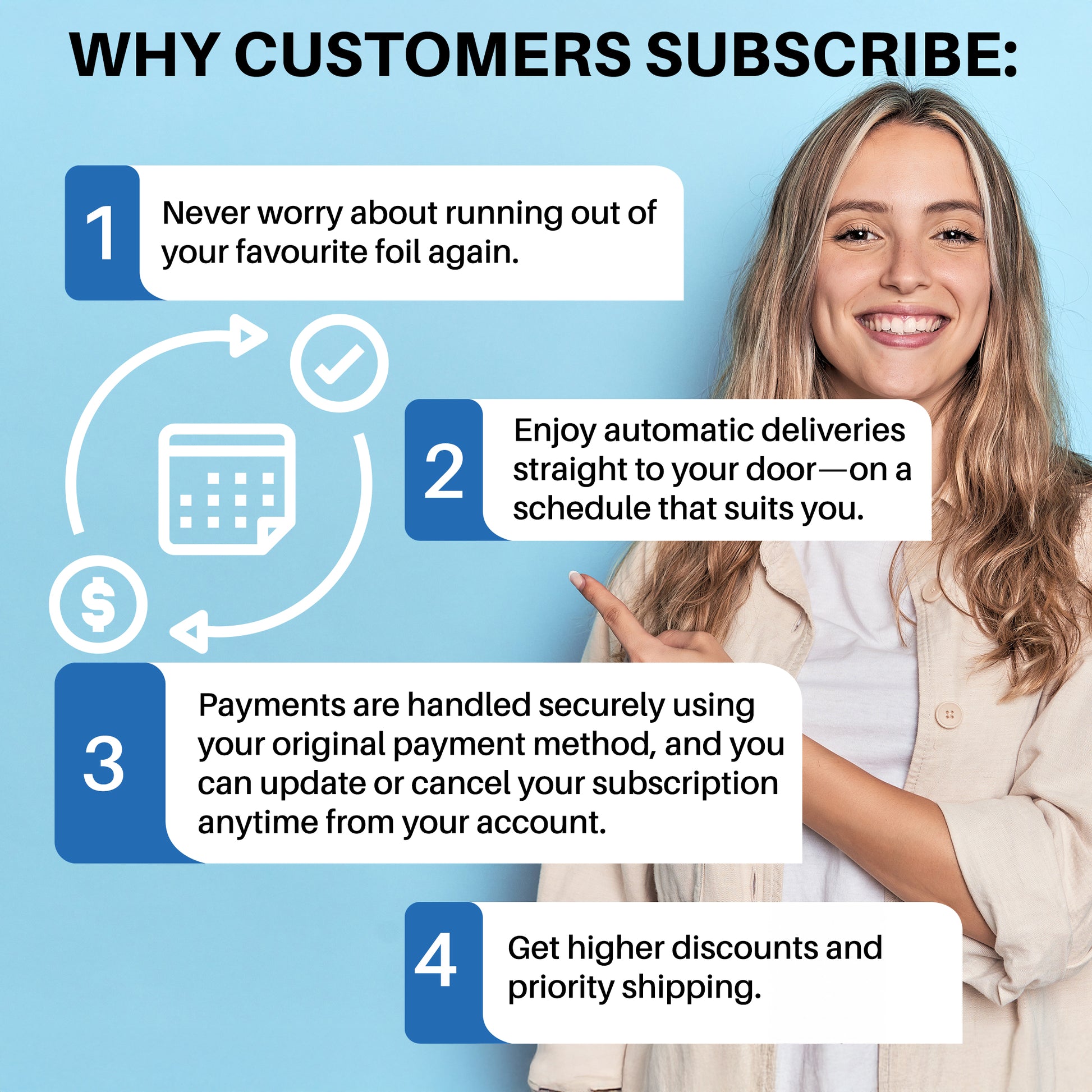 Carton Subscriptions: Never run out of your favourite foil again! With our EZ subscription service, your preferred foil is automatically delivered to your door on the schedule you choose. We’ll take care of everything. Payments are processed using your original payment method, and you can update or cancel your subscription anytime through your customer account. It’s simple, convenient, and completely hassle-free.
